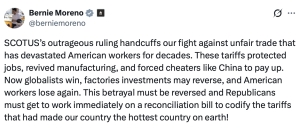 WASHINGTON – Today, Senator Bernie Moreno (R-Ohio) released the following statement on the United States Supreme Court’s ruling on President Trump’s tariffs.